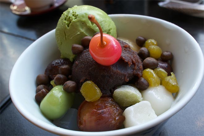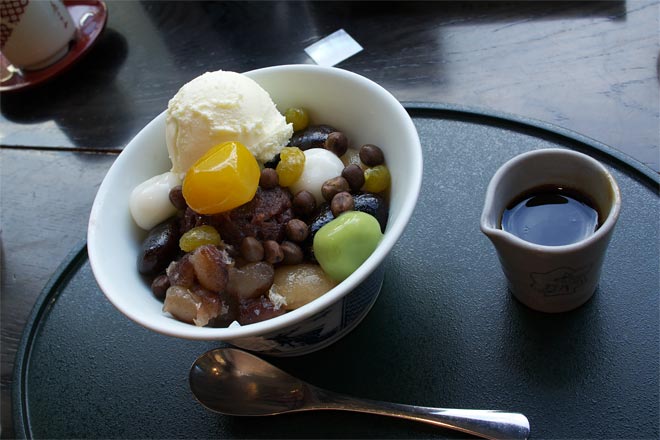 こちらの甘味。 なかなかのボリュームと味わい。 まずかき混ぜる前に、みつをふらっとかけて召し上がってみてください。