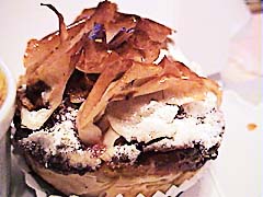 パリパリとした上のパートフィロー状のものの食感と 中の甘味のたっぷりと入ったリンゴ煮。 角切り、酸味もしっかり。 シャクシャクとした食感とちょっと焦げた香ばしさが非常によろしい。 450円。 お店の代表作らしいが、まさに名作。 2002.12 |