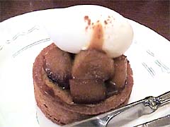 ネブレスコ 380円。 なめらかなムースの食感がよい。 甘さ控えめ。 チョコは酸味が強めで、中のバナナ(ペースト?)も酸味を感じる。 チョコとバナナの酸味の対比が面白い。 写真奥。 シューアラクレーム 180円。 店内で食べるから、シューがサクッとしけているかと思ったら、 ちょっとしけ気味。 シューは大きめでこのお値段は安い。 ふんわり系のシュー。 バニラ粒が入ったクリームはたっぷりと。 生クリームが多めの少し軽めのレシピ? 食べではあり。 全体を通して、廉価に感じるが、その分味もデイリーな感じ。 場所がら、そんな感じなのかもしれない。 サンドイッチの後に頂くのはちょうどよいかもしれないが。 2003.2 |