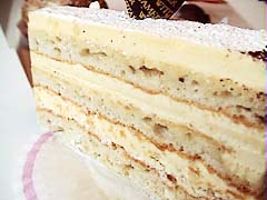 名称失念。 350円。 写真右。 言ってみるとバターケーキのようだ。 ベルギーの伝統的なお菓子との解説あり。 上質なバターが使われているのが分かる(ような気がする)。 パンとバターとのサンドイッチ状態。 上にのった砂糖だろうか? 口の中でほろほろ、しゅ〜という感じで溶ける様に嫁さん大絶賛。 私的には普通なのだが・・・・ これの味わいで1000円以内というのはお値打ち感がある。 2003.2 |