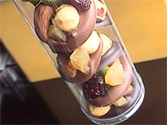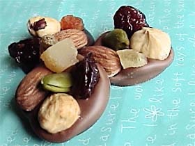 ナッツの香ばしさ、ドライフルーツなどの旨みが渾然一体となったこのチョコは 是非一口でぱくっといって欲しい。