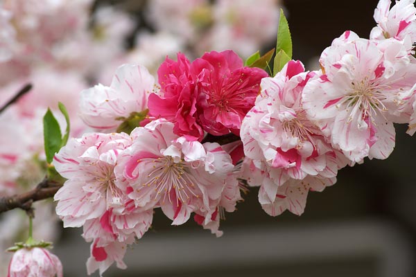 そのアップ。 同じ木に、白と赤と混じったのが咲いております。 源氏桃だったかな?