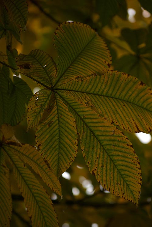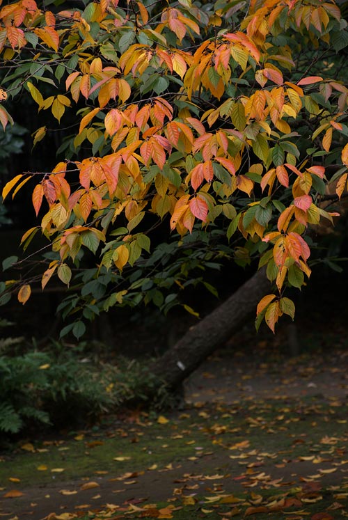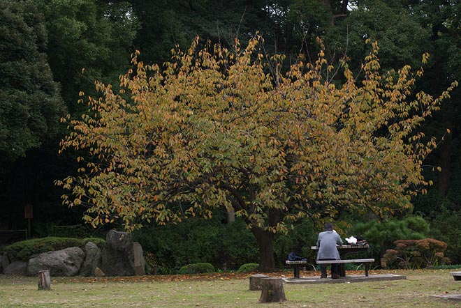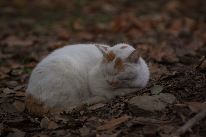 庭園の近くの公園でうたた寝している猫を。 落ち葉がいい寝床?