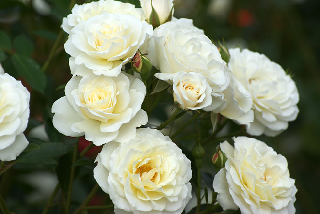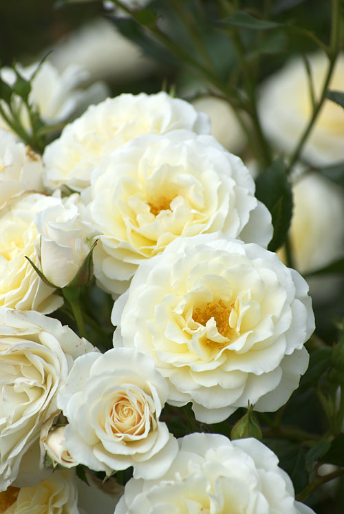 丸い蕾、ソフトな花色。 大輪の房咲き。