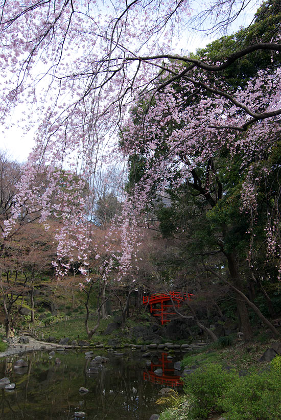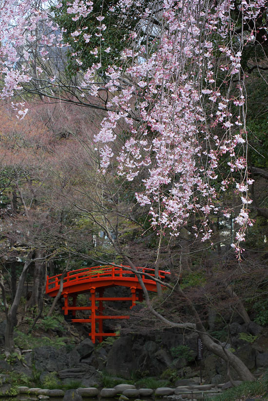 ピンクのしだれ桜と赤い橋。