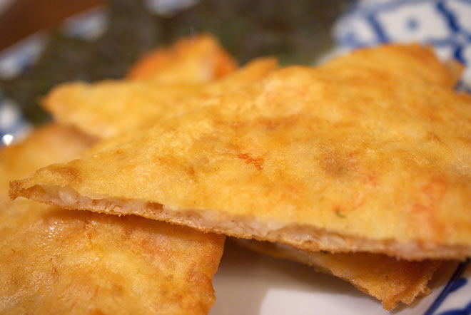 周りがパリパリした食感で、ビールに合いそうな感じ。 甘辛いたれをつけていただきます。