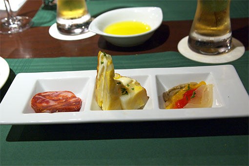 前菜はタパス3種。 頼んだコースは1800円のパエリアランチ。