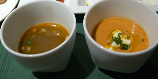 スープは2種類から選べます。 ガスパチョと(温かい)レンズ豆のスープ
