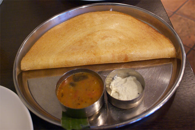 サンバルとチャトニ(ココナッツソース)をつけて。