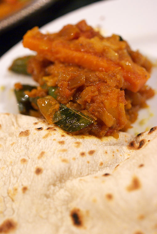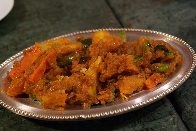 いんげん、じゃがいも、たまねぎ、人参を使ったサブジ。