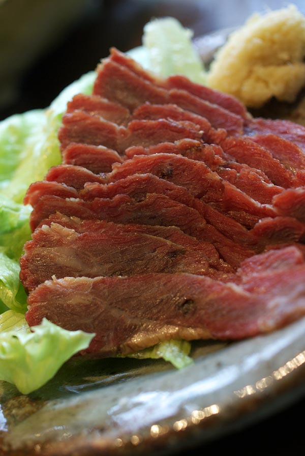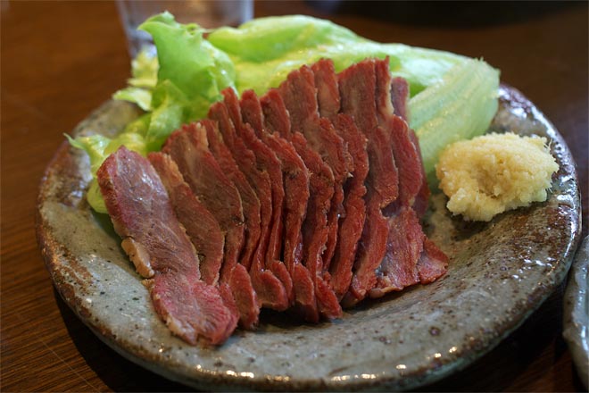 しょうがのすりおろしを桜肉に乗せて、くるっと巻いて、ちょっとタレにつけていただきます。