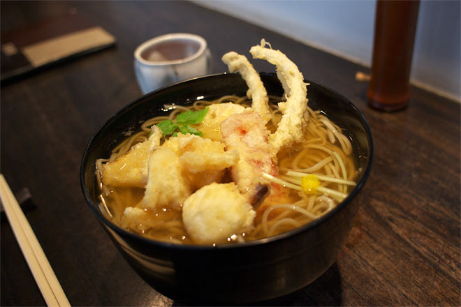 蕎麦は緑色をしたなかなか綺麗なもの。 大盛りで+300円。