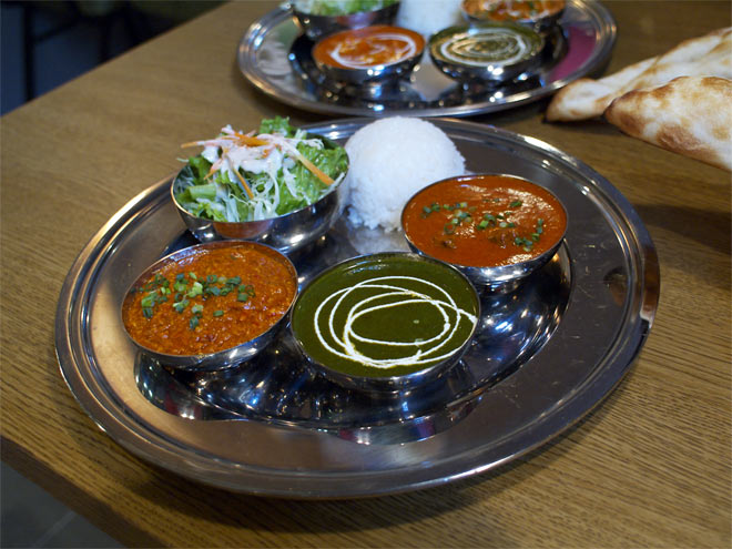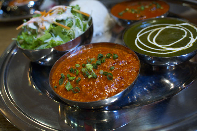 プルニマランチ(1250円:マトンカレー、キーマカレー、ほうれん草カレー、ナン&ライス、タンドーリチキン、フィッシュティッカ)