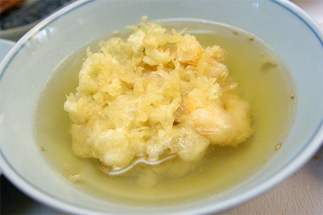 こちらは番茶系だったかな? かき揚げは、えび、小柱など具沢山。 油が強く、キレが弱く。