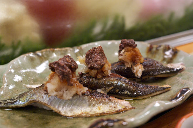 上にはレバーがのっておりますが、間には大根のすりおろしも一緒に。 さんまはご覧のように軽くあぶっており、