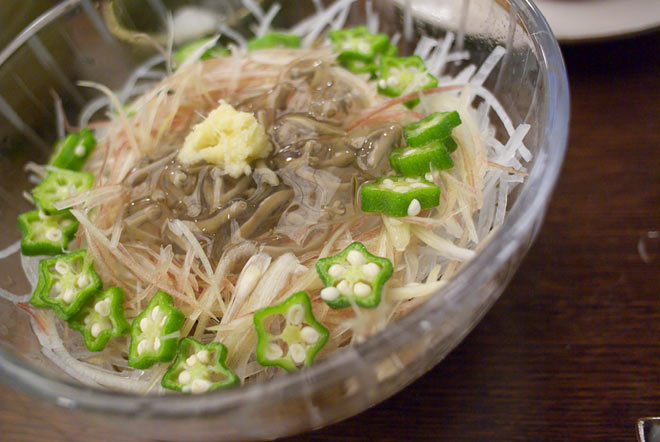 ヒットなそばはこちら。 じゅんさい、おくら、さらししょうがなどの強壮になるようなものたちと酸味の利いたこの時期にあったさっぱりとした味わいは、そばをもっとも手繰りたくなります。