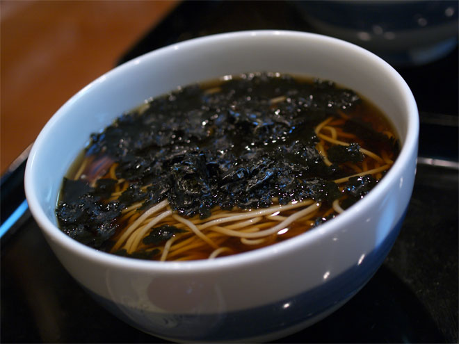 680円。 知らなかったのですが、かけそばに焼き海苔を乗せ、薬味はおろしワサビが決まり、、というオーソドックスな蕎麦らしいです。