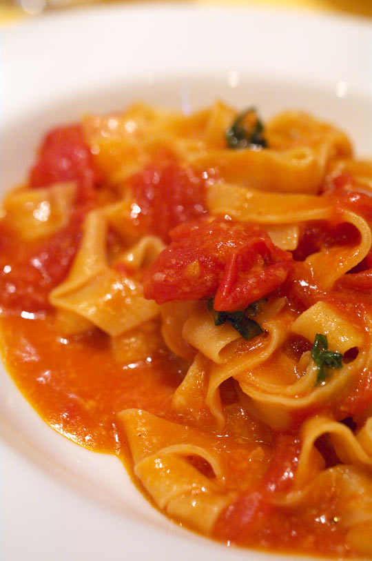 手うちパスタのタリアッテレのトマトとバジルのソース