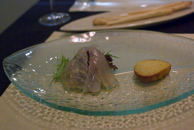 尾長鯛は、バジルの塩漬けでマリネしたとのことで、やや私には塩分が強い、、、が、うまい!