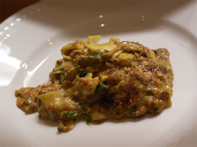 チーズが濃厚な香り。 ミンチ肉やほうれん草(?)、人参、青菜など。