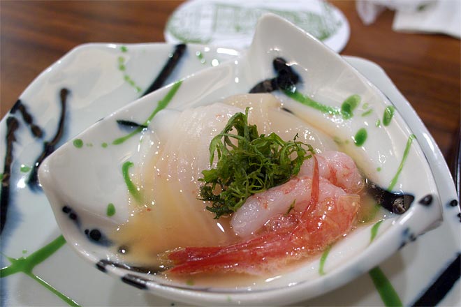 帆立、紋甲烏賊、甘海老のフレンチ風梅肉和え フレンチ風・・・? 梅でさっぱりと口直し。