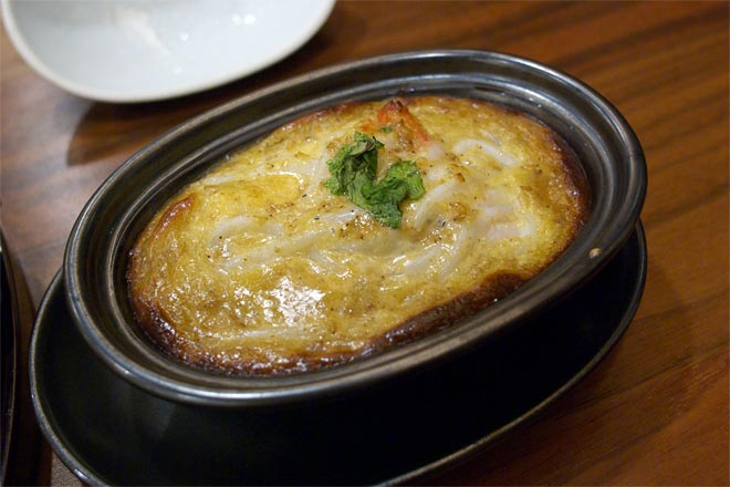 伝宝焼 穴子、白魚、豆富、ずわい蟹、焼葱、三つ葉 ごまと味噌でいい感じ。和風グラタンちっく。