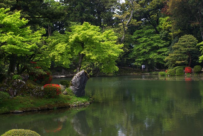 霞ヶ池。 園内のほぼ中央にある池。 奥には、内橋亭を。