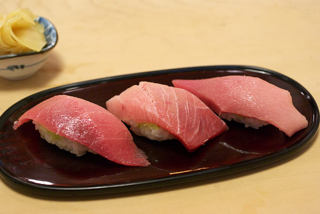 マグロ3種。 左から、中トロ、大トロ、はがし(といわれる部分)。