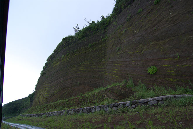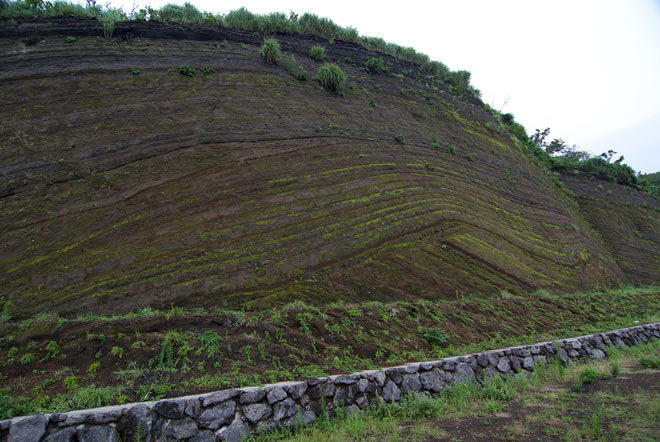 1万5千年前から数百回に及ぶ三原山の噴火によって、火山灰等が幾層にも重なってできた地層、、だそうです。