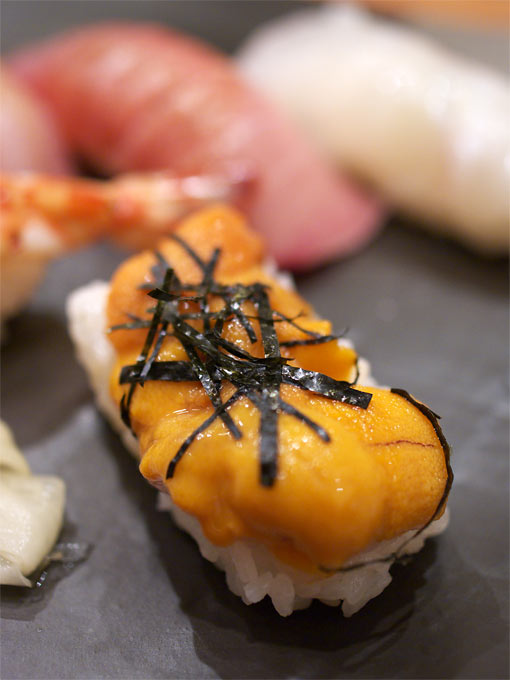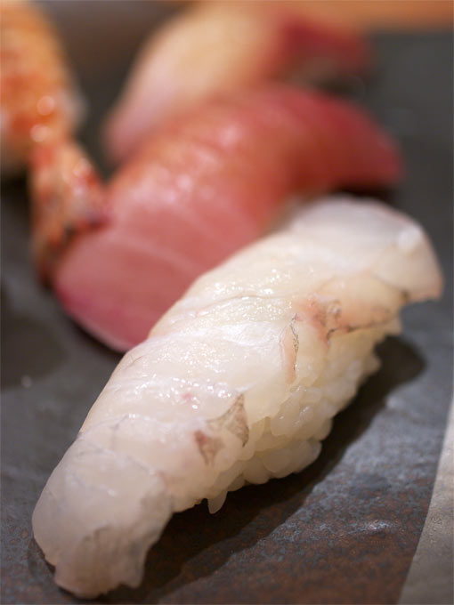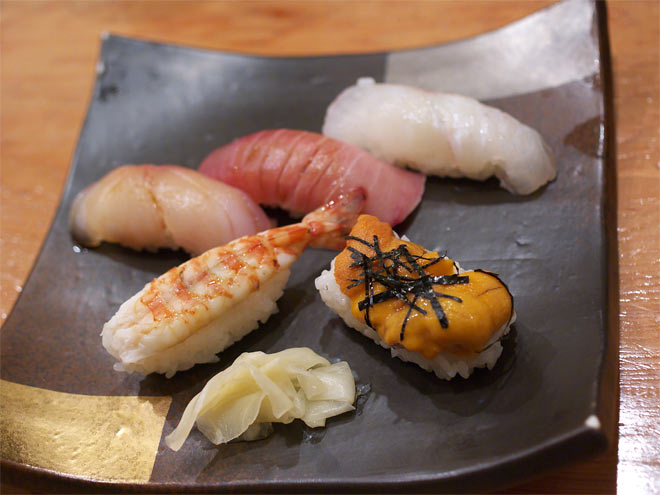 ヒラメ、中とろ、ひらめの塩、えび、うに。