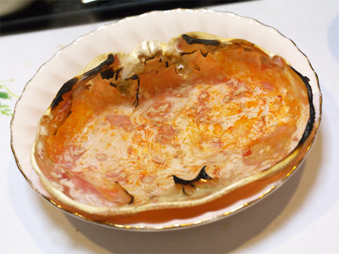 綺麗に食べて、お酒を注いで、軽くを火をいれて完成する甲羅酒。
