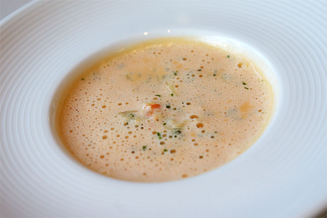 こちらはアミューズ。 甲殻類のスープ。 エシャロットや香草をきかせたアメリケーヌ味のスープ。