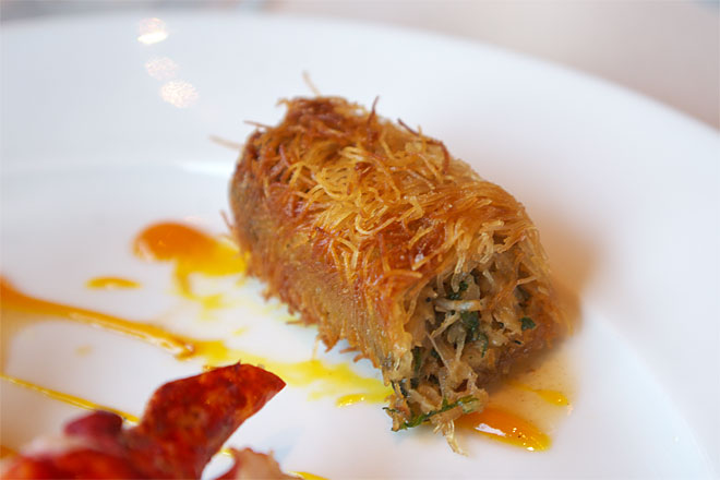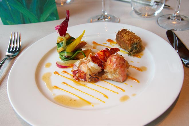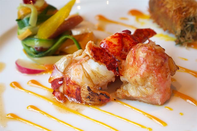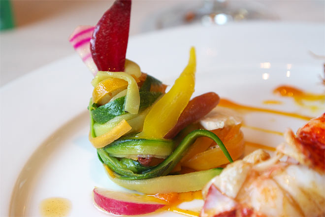 オマールの甘さに、野菜の甘さをあわせたいのだと思うのだが、、、まったくばらばらな感じ。