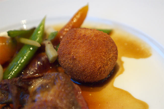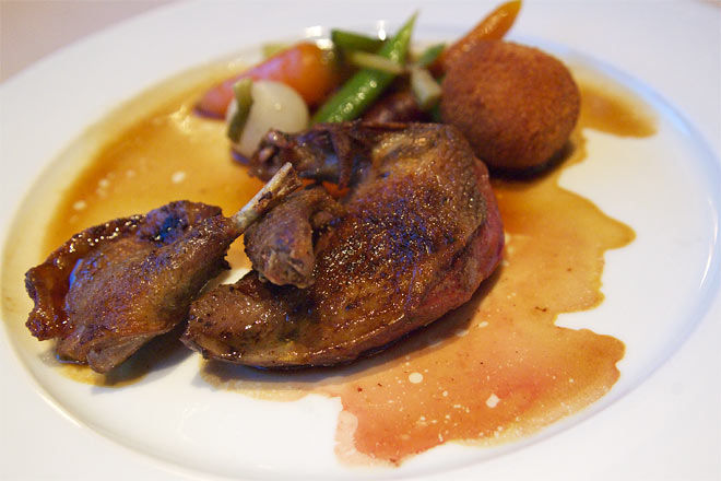 Pigeon d'Alsace roti, mijotee de legumes printaniers