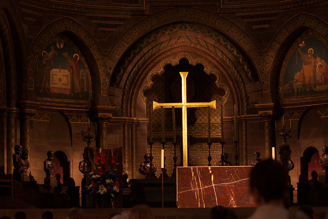 正面の十字架を。 人の頭が写ってしまっておりますが、かなり人がおります。 あとはステンドグラスを。