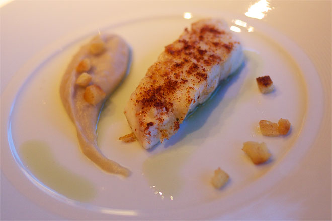 徐々に暗くなってきます。 スズキ。 フェーブトンア(?) 空豆を一緒を使ったピュレ。