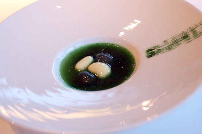 黒はイカ墨。 緑のスープは甲殻類のスープで、色合いはクロロフィルだそうです。