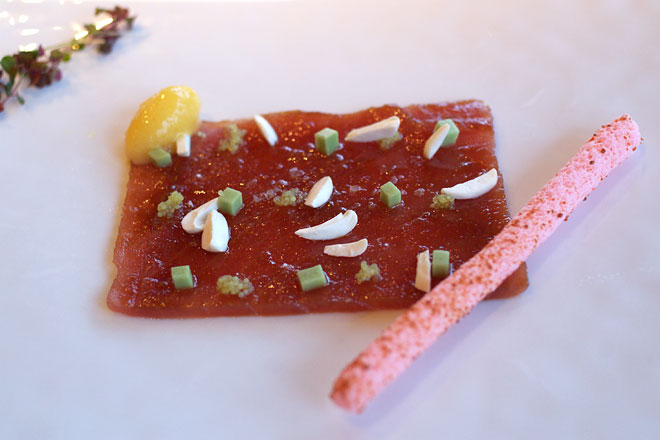 マグロのカルパッチョ。 生のアーモンドは風味は弱いが、食感がなかなかフレッシュで面白い。