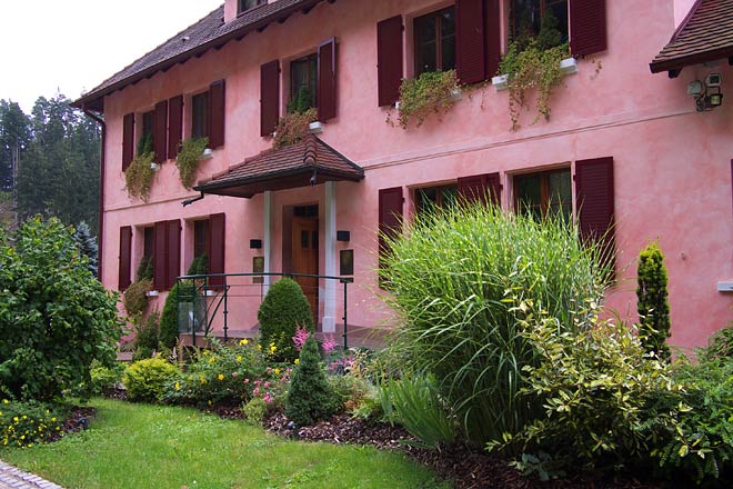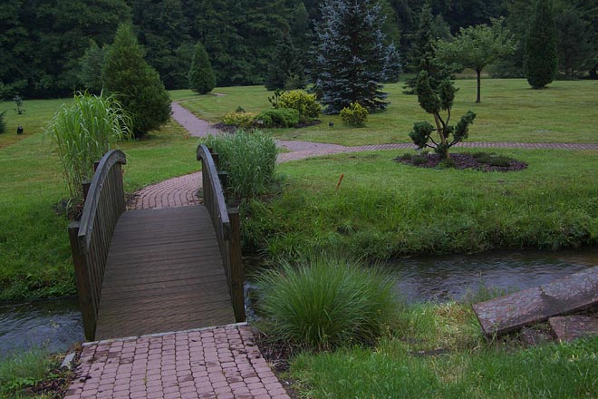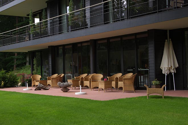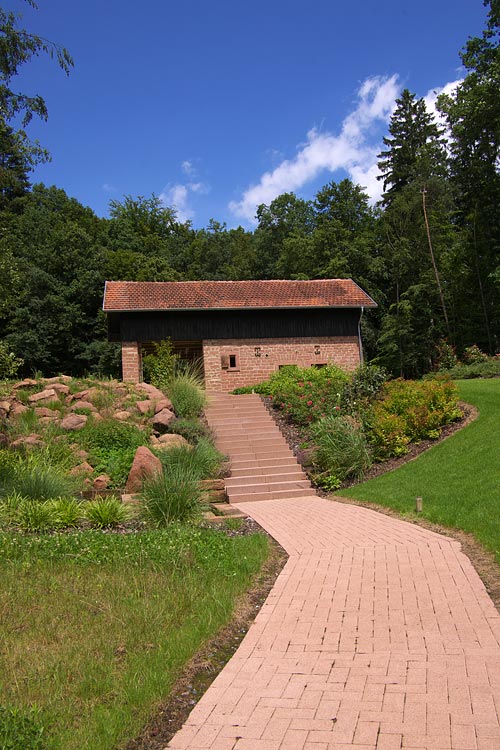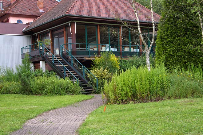 ホテルから、レストランのほうに降りてそのまま庭のほうに向かっているところです。