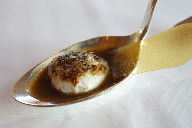 これを先に頂いてから、ウズラの卵を頂きます。 ソースはトリュフとフォワグラ。 レンズ豆と一緒に。