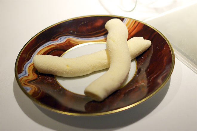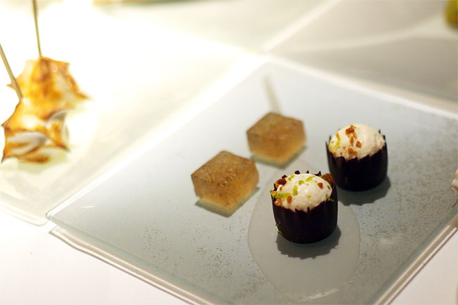アニス風味のメレンゲとヨーグルトをくだいたもの。 人参のソルベとフヌイユのゼリーが下に。
