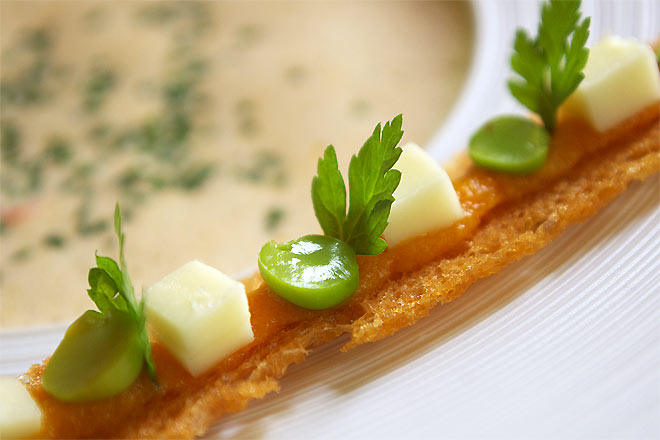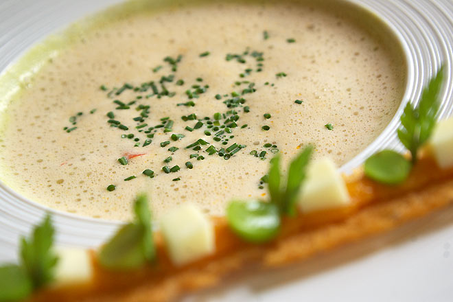 グリーンピースのベルーテ(小麦などでとろみをつけたスープ)。エクルヴィスのエミルション。