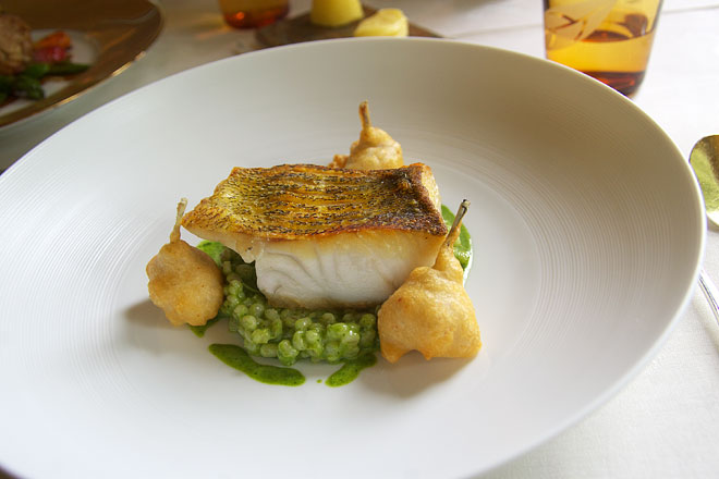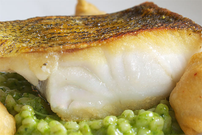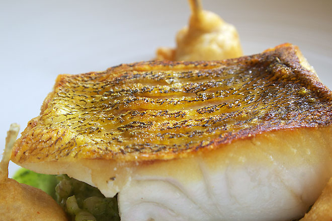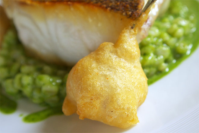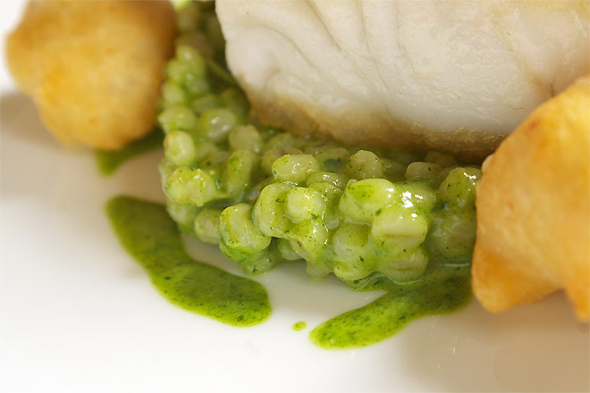 Le filet de sandre, tempura de grenouille, risotto vert d'orge perle, jus d'oseille