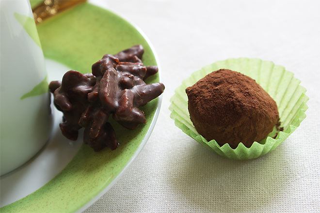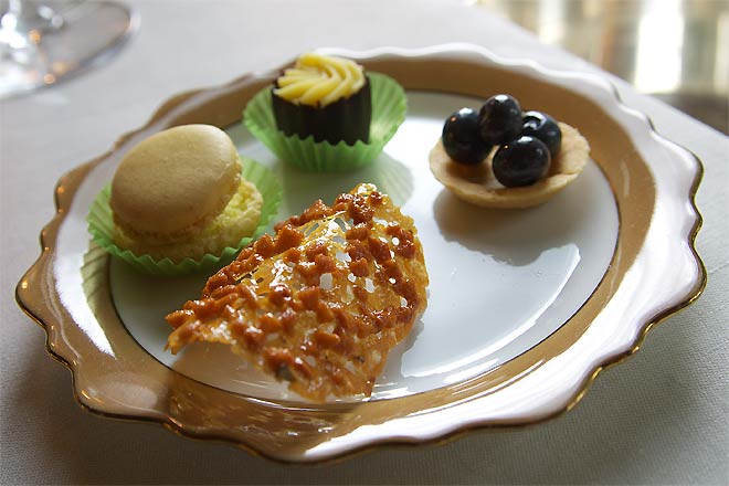 アプリコット、青りんご(ポンム)、カシス、グリオット(ジャムのような濃厚さとたっぷりのお酒)。かしわの葉っぱみたいのがしいてあります。