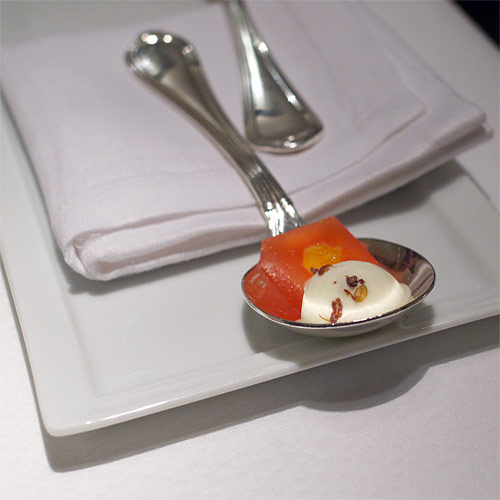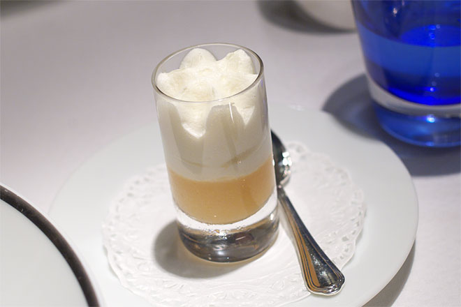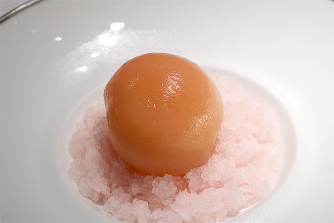 白桃のコンポート マラスキーノ風味のグラニテ ジャスミンのムースリーヌ