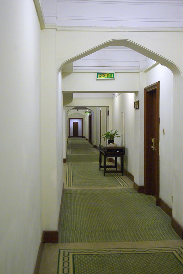 こちらは北楼の廊下。実際のライトはもうちょっと暖色系です。