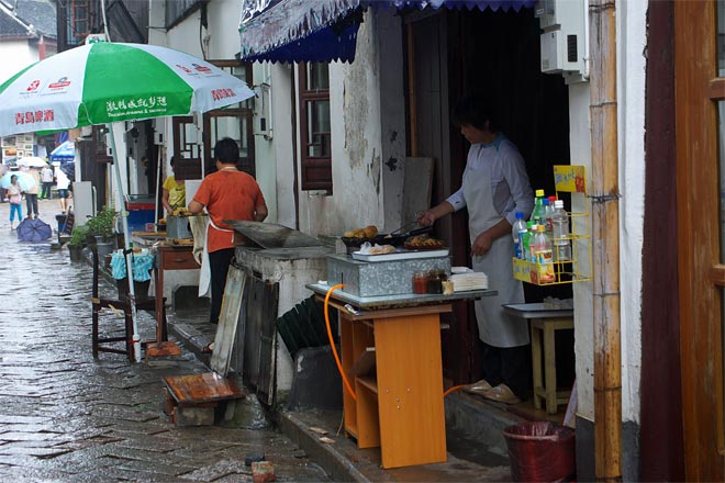 通りは路面が濡れてこんな感じに。 実際に生活している人もいるようです。