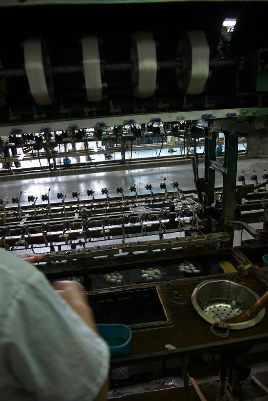 作業しているように見えますが、他のラインはがらがら。 見せるために一箇所だけで蚕の繭から糸を取ってます。