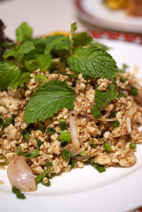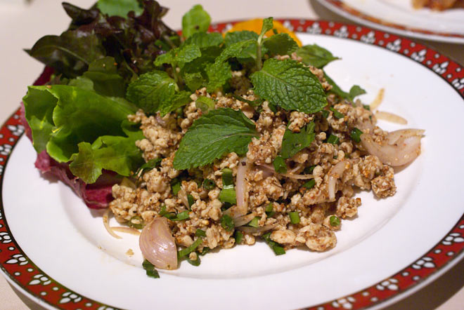 玉ねぎ、ミント、チキンミンチ肉などのスパイシー炒め。