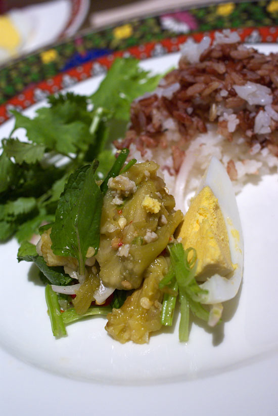 くったりとした焼きなすにミント、えび、玉ねぎ、豚肉の細切りなど。